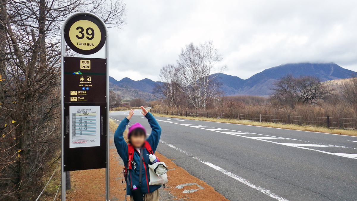 東北道で事故渋滞に1時間以上も巻き込まれるというハプニングがあり、中禅寺湖を通り過ぎて戦場ヶ原の赤沼に到着したのが11:20。予定を考えるとギリギリスタートな感じ。いろは坂の手前は紅葉が多少綺麗でしたが、中禅寺湖より上の方はもう紅葉シーズンが終わっていました。そのかわり人も少なかったですね。赤沼の無料駐車場に車を停め、赤沼バス停11:44発の湯ノ湖行きのバスに乗って終点手前の湯ノ湖湖畔バス停で下車。運賃は2人で630円でした。この赤沼から低公害バスが発着していて、中禅寺湖西岸の千手ヶ浜まで行けます。今度使ってみたい。