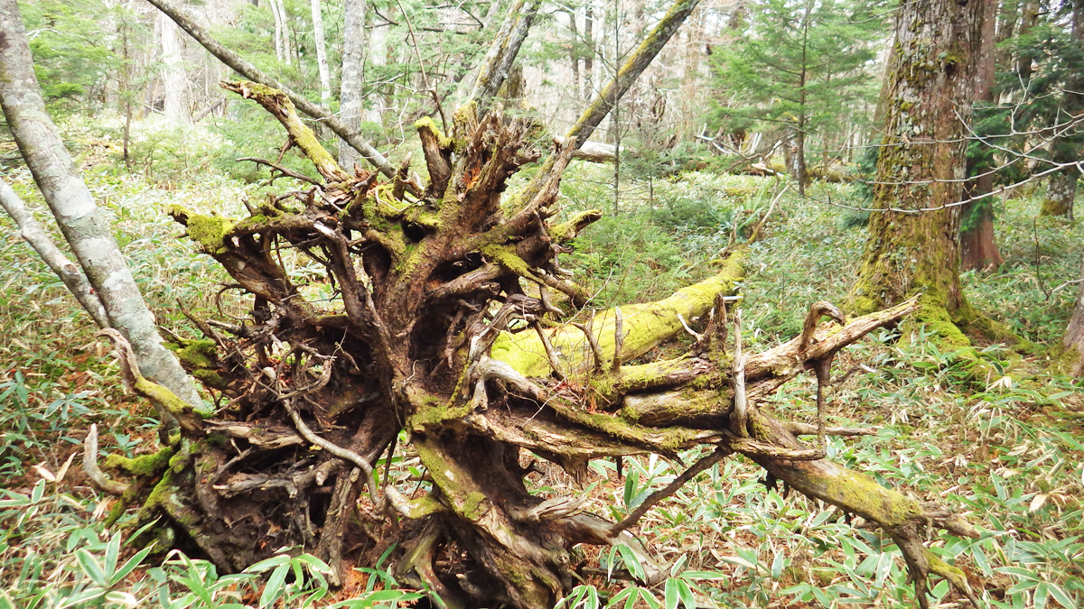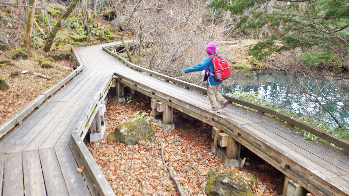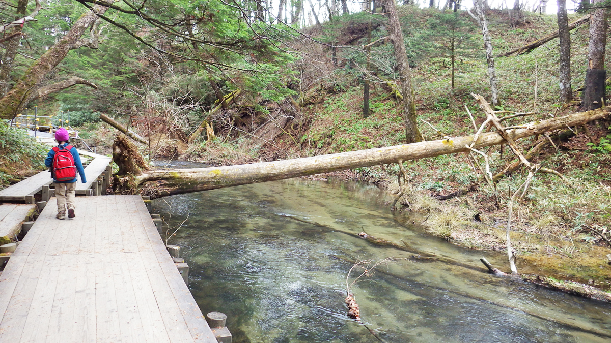 湯ノ湖から下、竜頭の滝を経て中禅寺湖に流れ込む湯川沿いに歩きます。この倒木の上には大勢が歩いた跡があるけど、私の登山靴のソールはパターンのエッジが摩耗のため丸くなって滑りやすいので、子供に「渡ってみて!」と言われましたがこりゃ無理ですわ。そろそろ登山靴も買い替えか…。