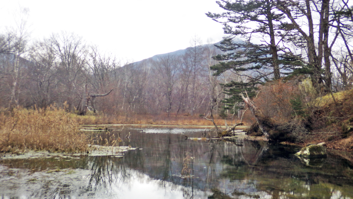 湯滝から30分ちょいで泉門池(いずみやど)の休憩所に到着。ベンチやテーブルがあってランチ休憩に最適。春や紅葉シーズンだと絶景でしょうけど、この時期はもう寂しい雰囲気しかありませんね。カモの鳴き声が寂しさを余計に増幅させる。ここでカップラーメンをすすってデザートは焼きバナナ。バターで焼き色を付け、砂糖をかけてカラメル状に仕上げたところ甘すぎて不評だった(笑)。最近コンビニでよく見かける個包装のバナナを使った。