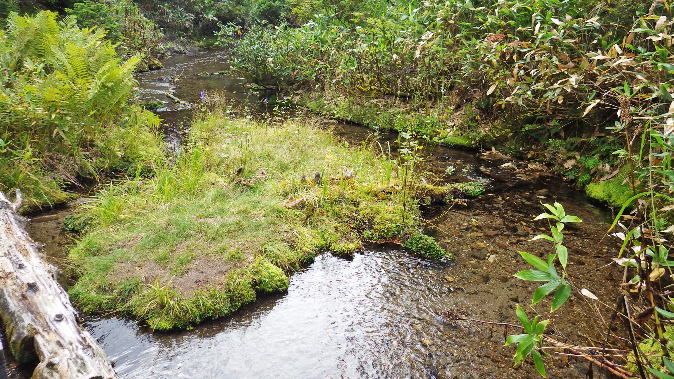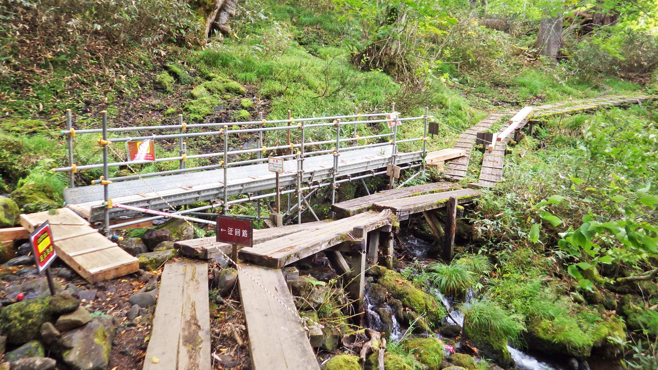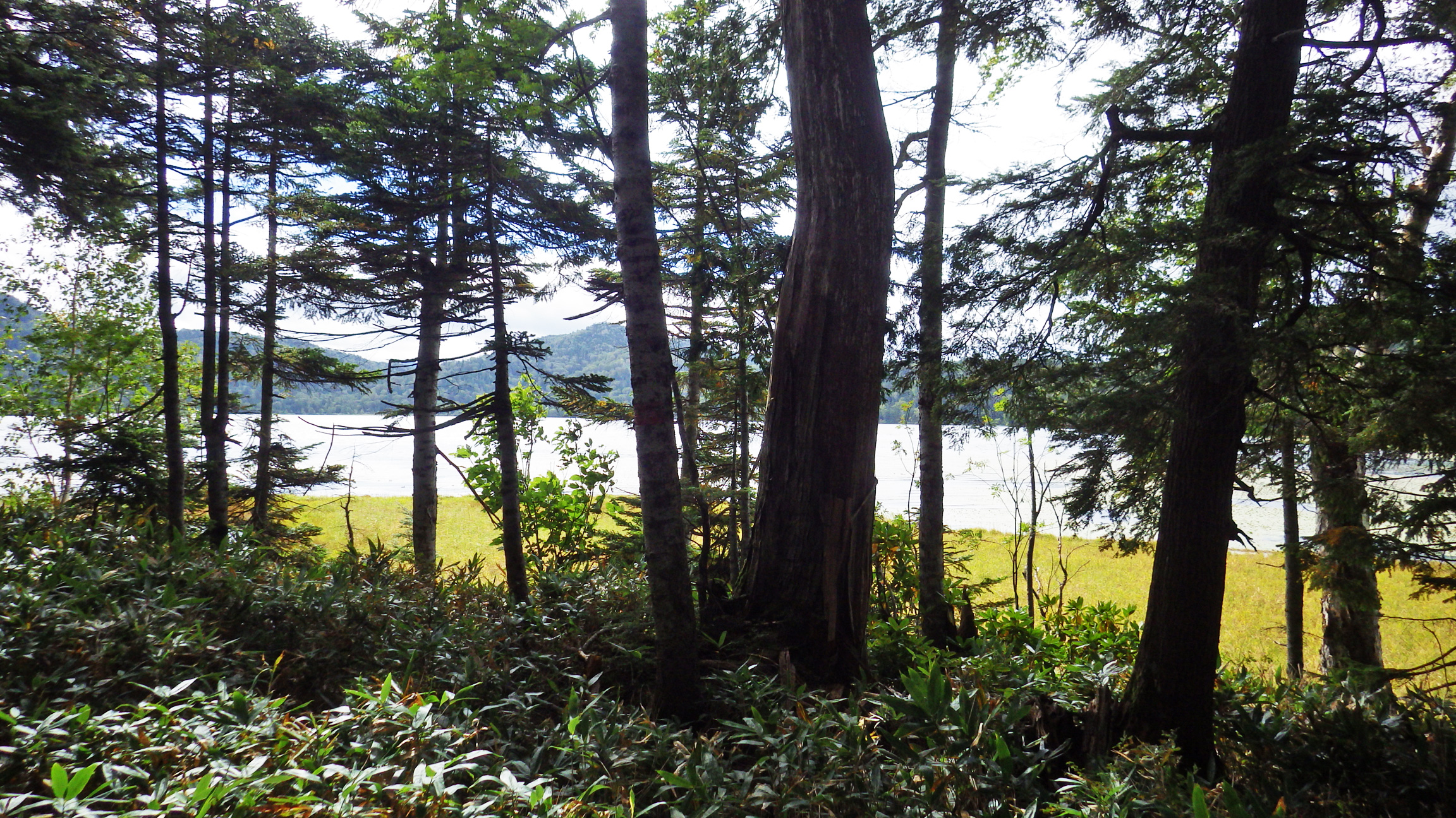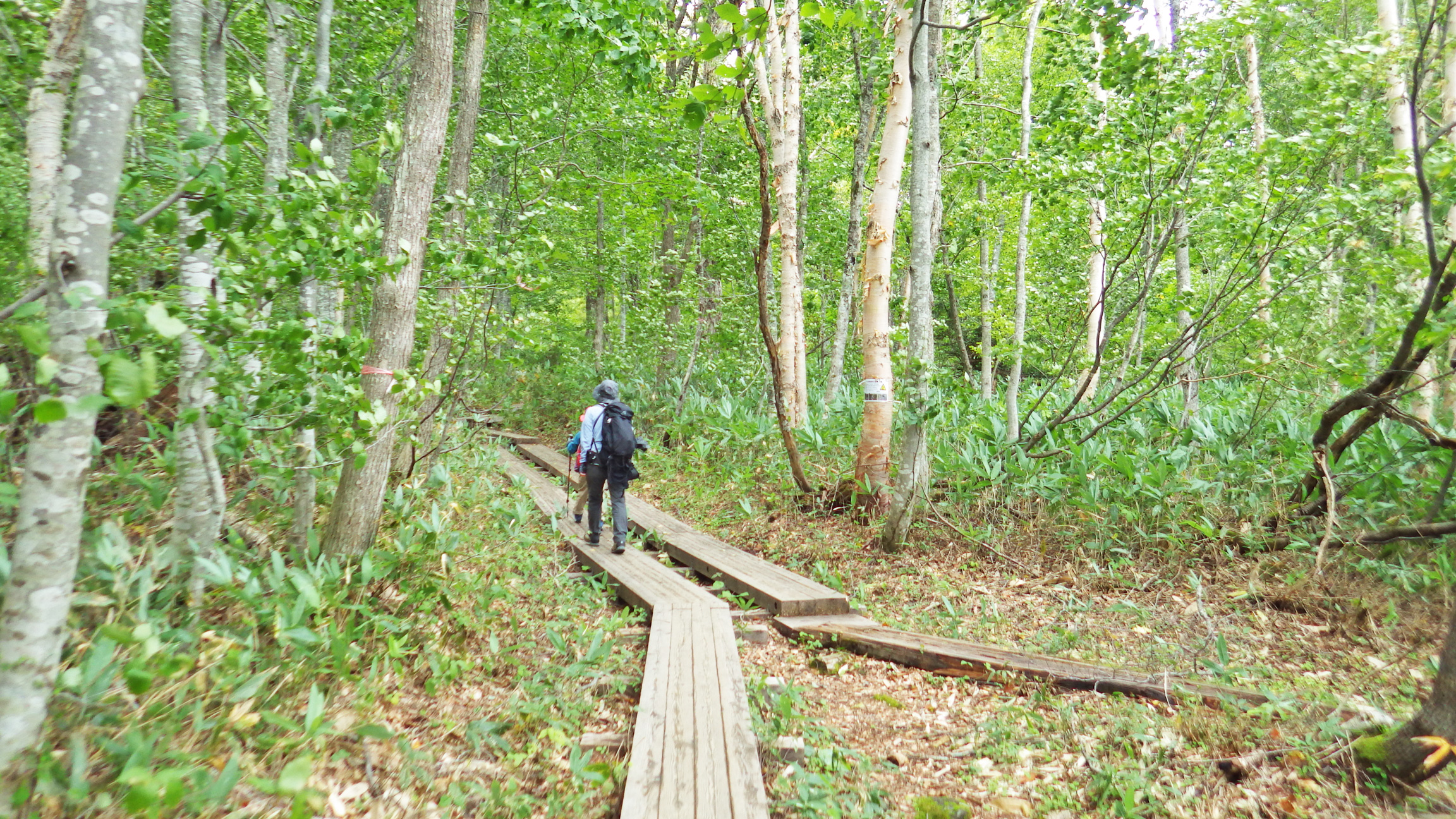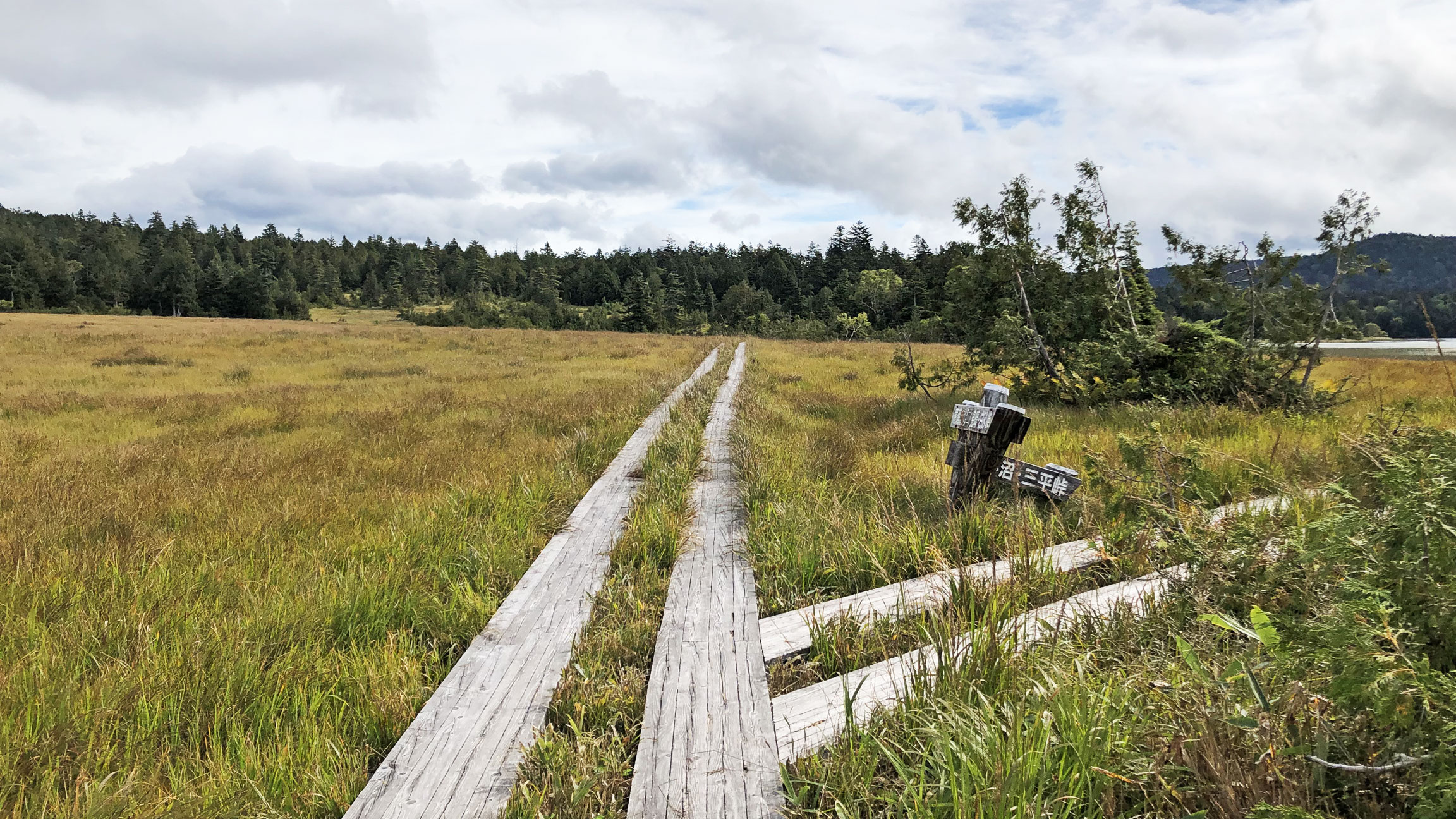 あちこち破損した木道を避けながら100mほど高度を上げると、樹林帯の中に唐突に現れるのが三平峠。この辺りはなんだかクマが出そうな雰囲気がある。