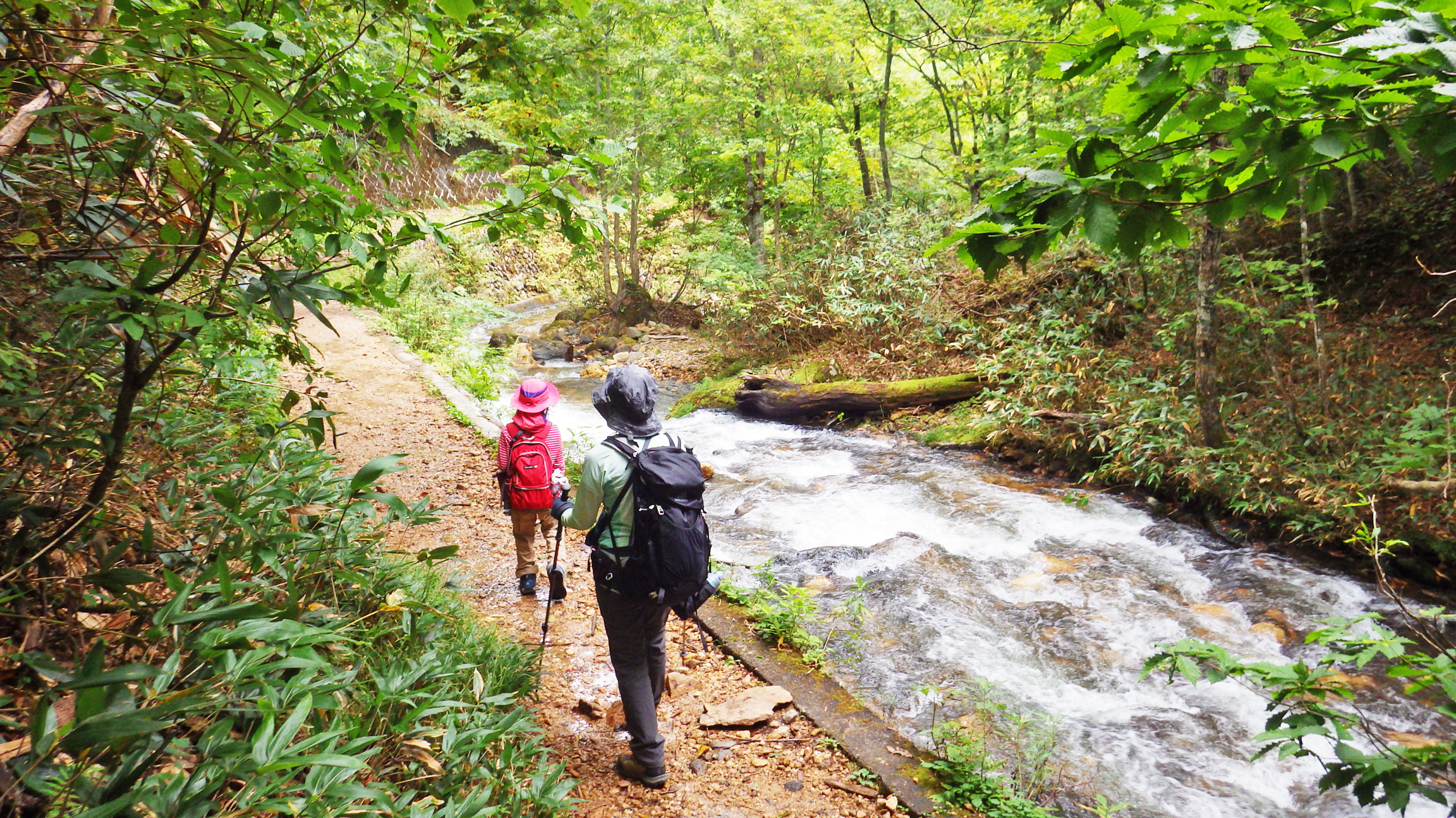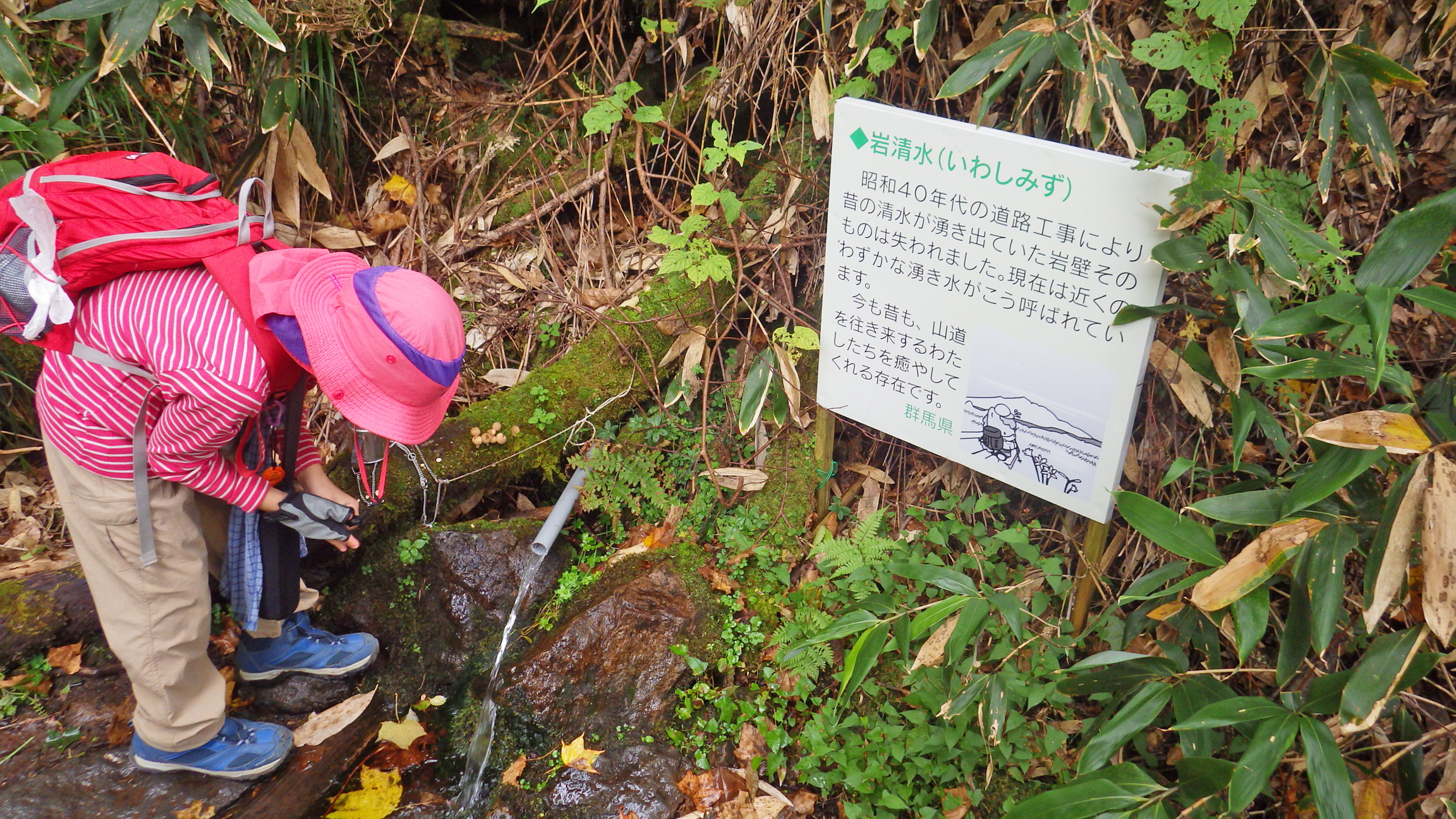 さらに下ると大きめの沢が現れ、涼しげな滝に歓声をあげる次女。この辺りには昭和40年代に作られた後放棄された車道の面影が登山道のそばに残っています。かつて大清水と福島県川の沼山峠を結ぶ車道の建設が進められましたが中止になり、車道の予定地だった所に植林されたという記事を読んだことがあります。おそらくこの辺がそうなのでは?