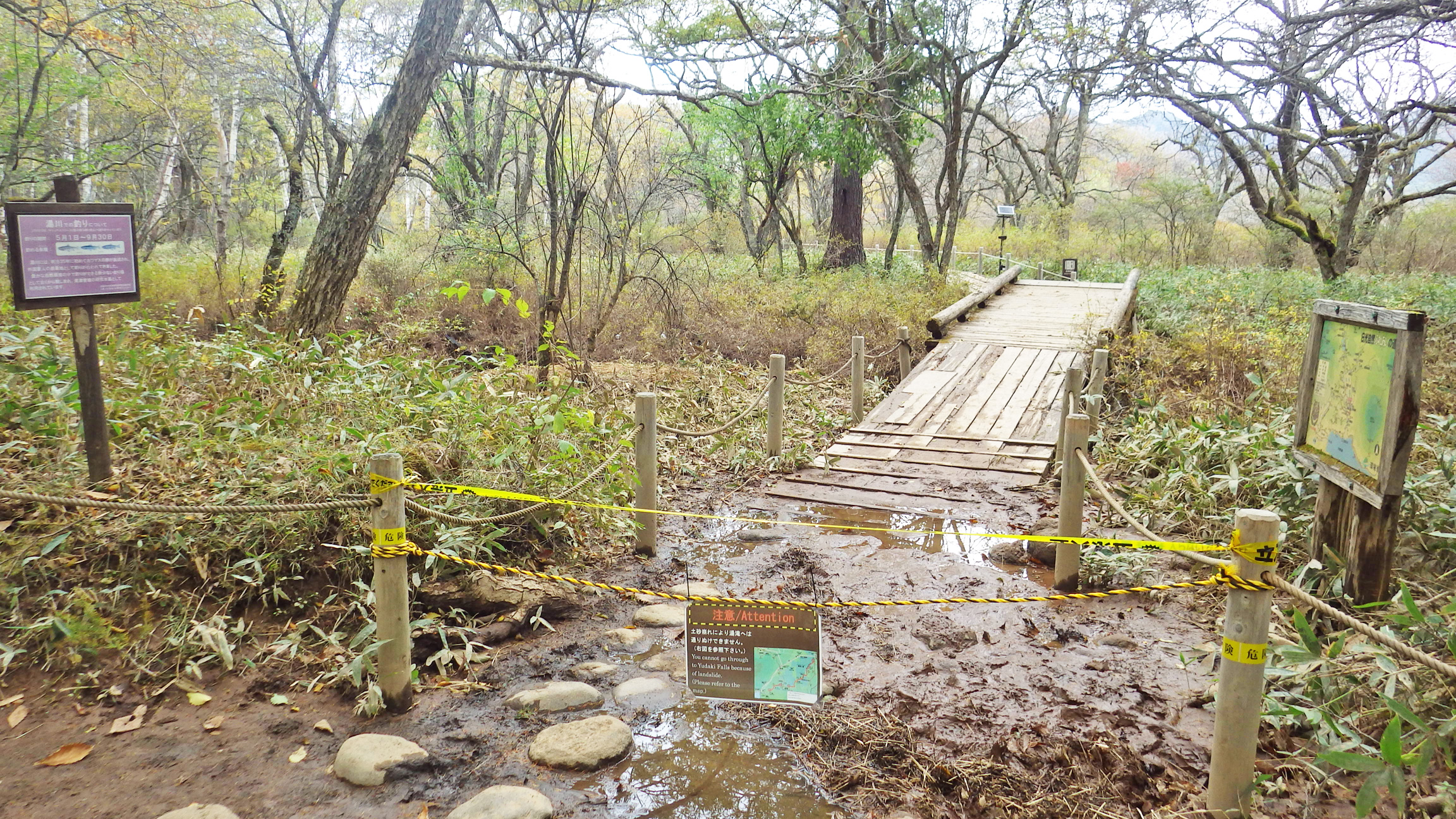 赤沼分岐から湯川沿いの自然研究路は通行不能となっていました。木道が流されたらしい。