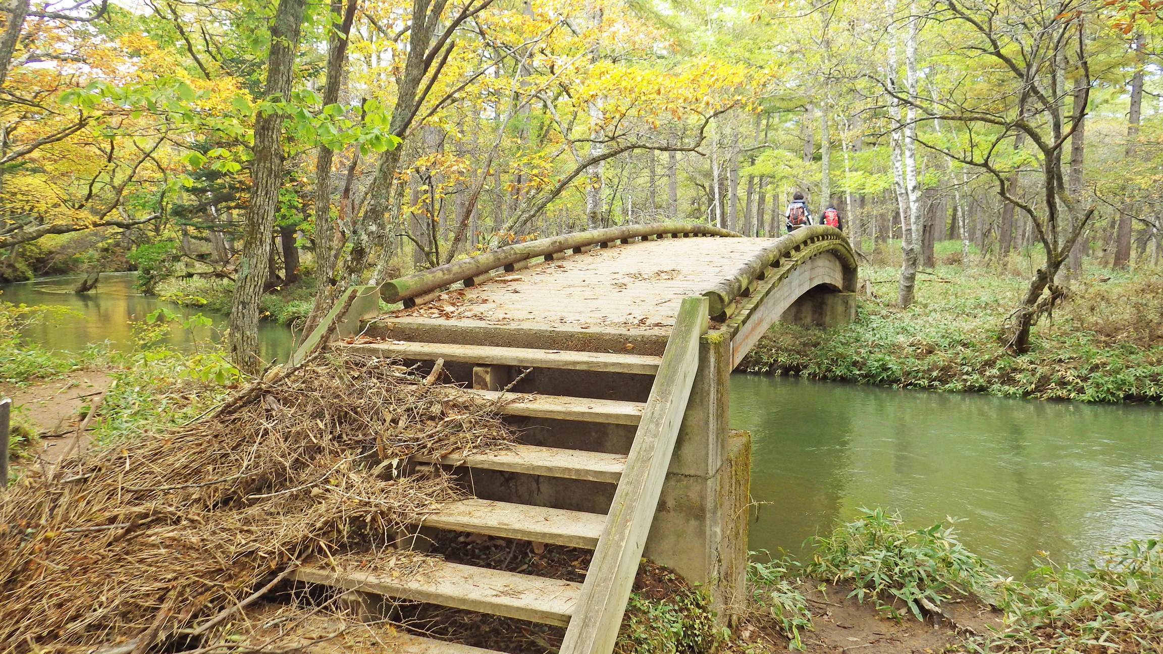 この橋を渡るとすぐ右側に西ノ湖入口バス停。10分ほど待ってバスに乗り込み、また小田代ヶ原で降車します。トレッキングポールがまだ残っているかもしれないと一縷の望みをかけて!