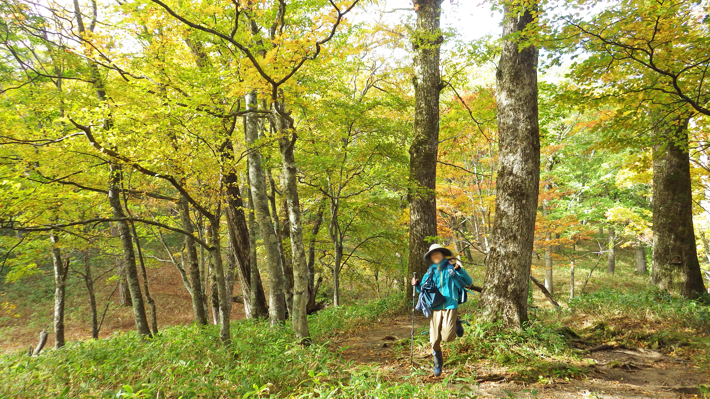 新鮮な木の香りを漂わせながら遊歩道をふさぐ倒木。通れないわけではにゃい。紅葉は目立たなくなって緑優勢。