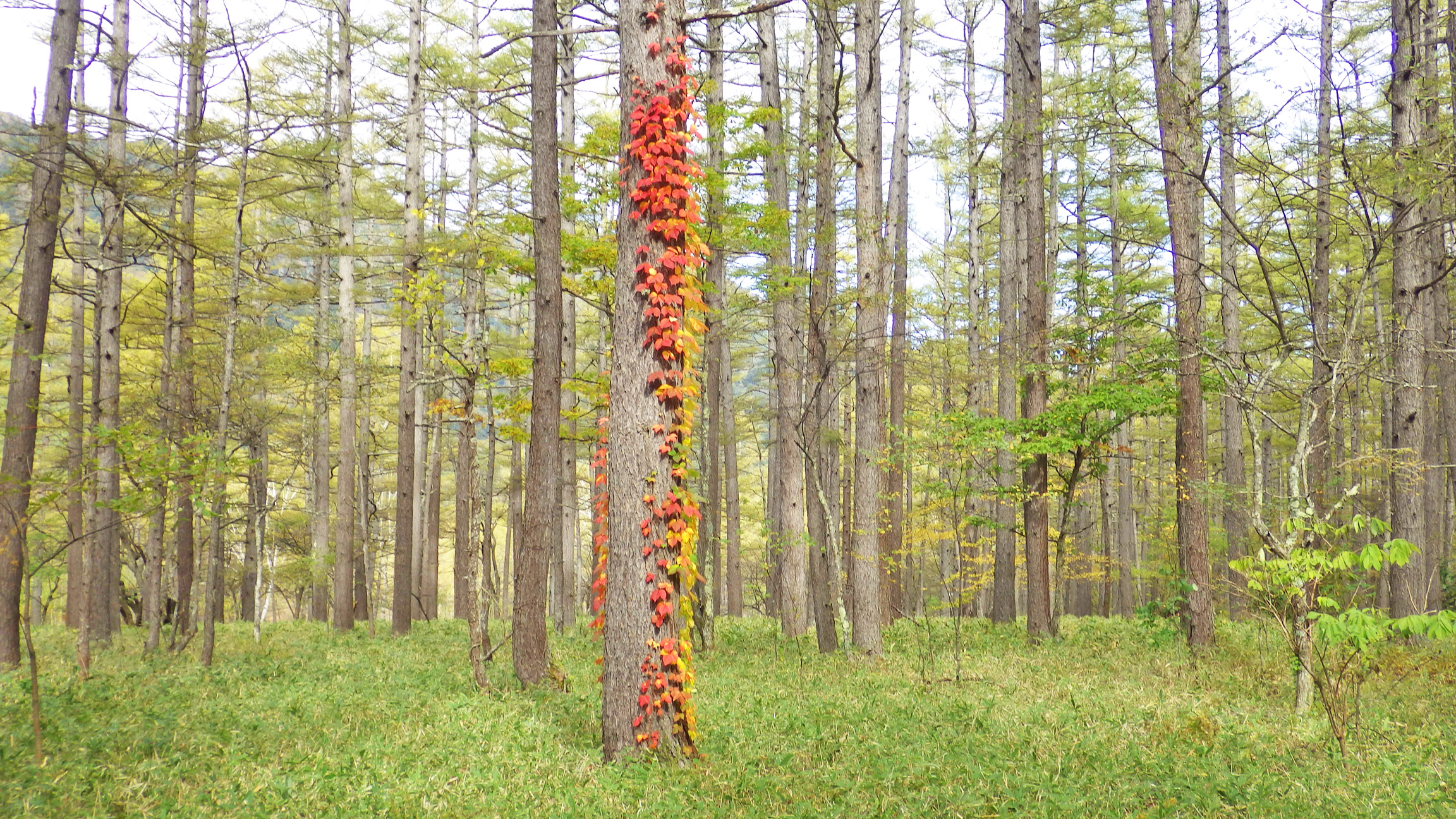 小田代ヶ原の東側を歩いている時に見つけた今回最も美しかった紅葉。このツタだけキレイに色づいていました。