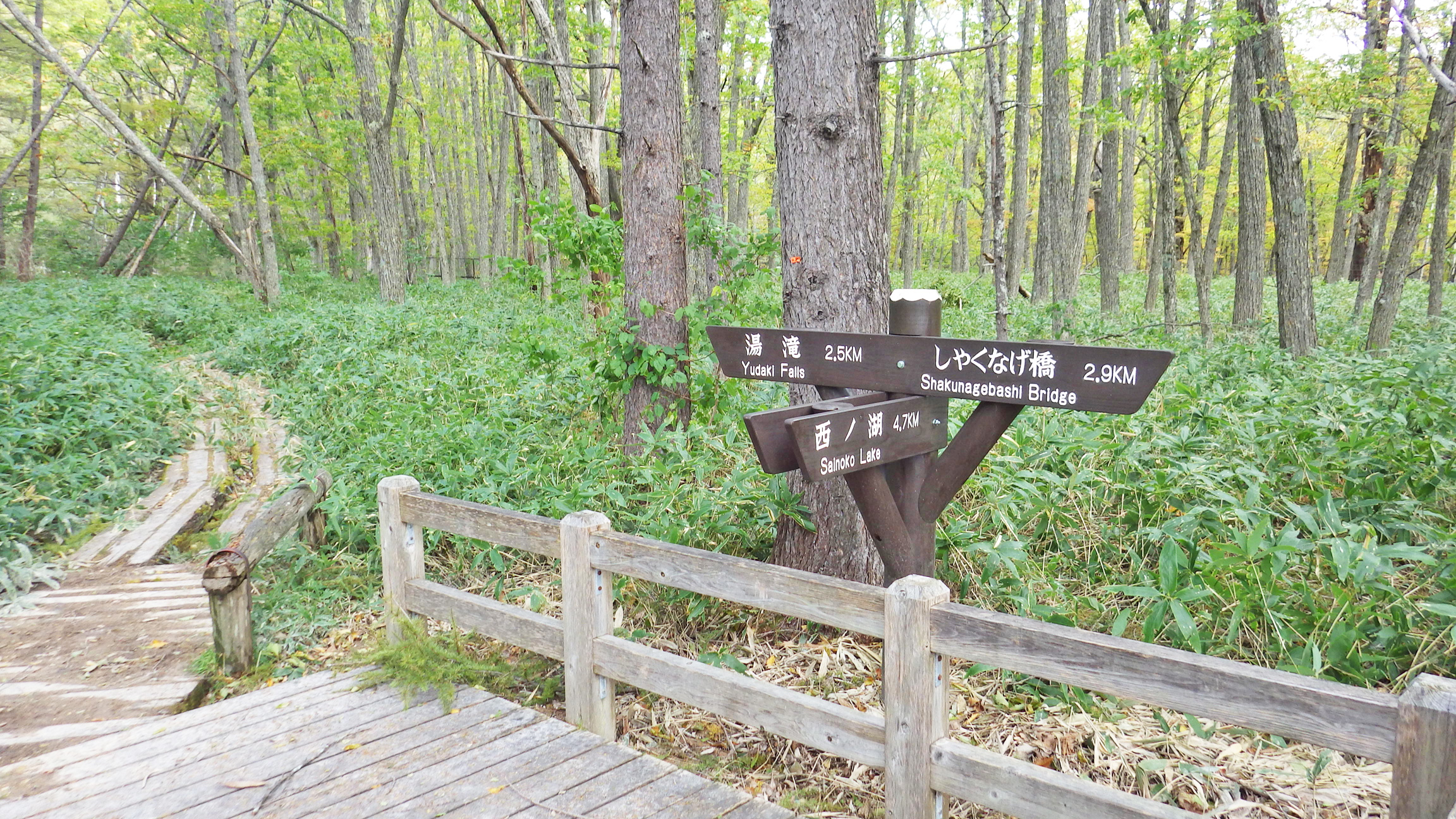 小田代へ続く道への分岐。左のしゃくなげ橋方面へ行くと竜頭の滝の上へ出る。