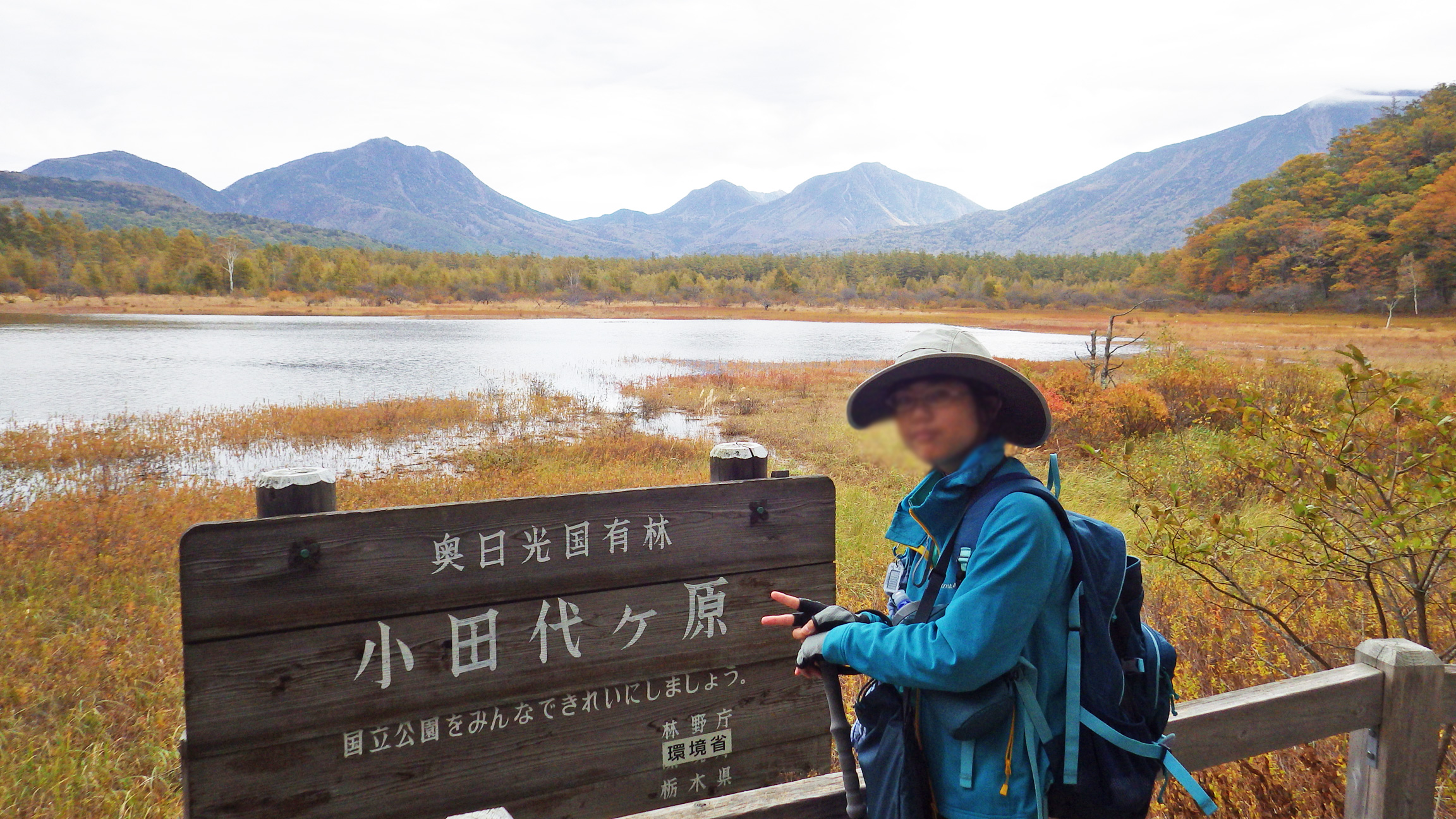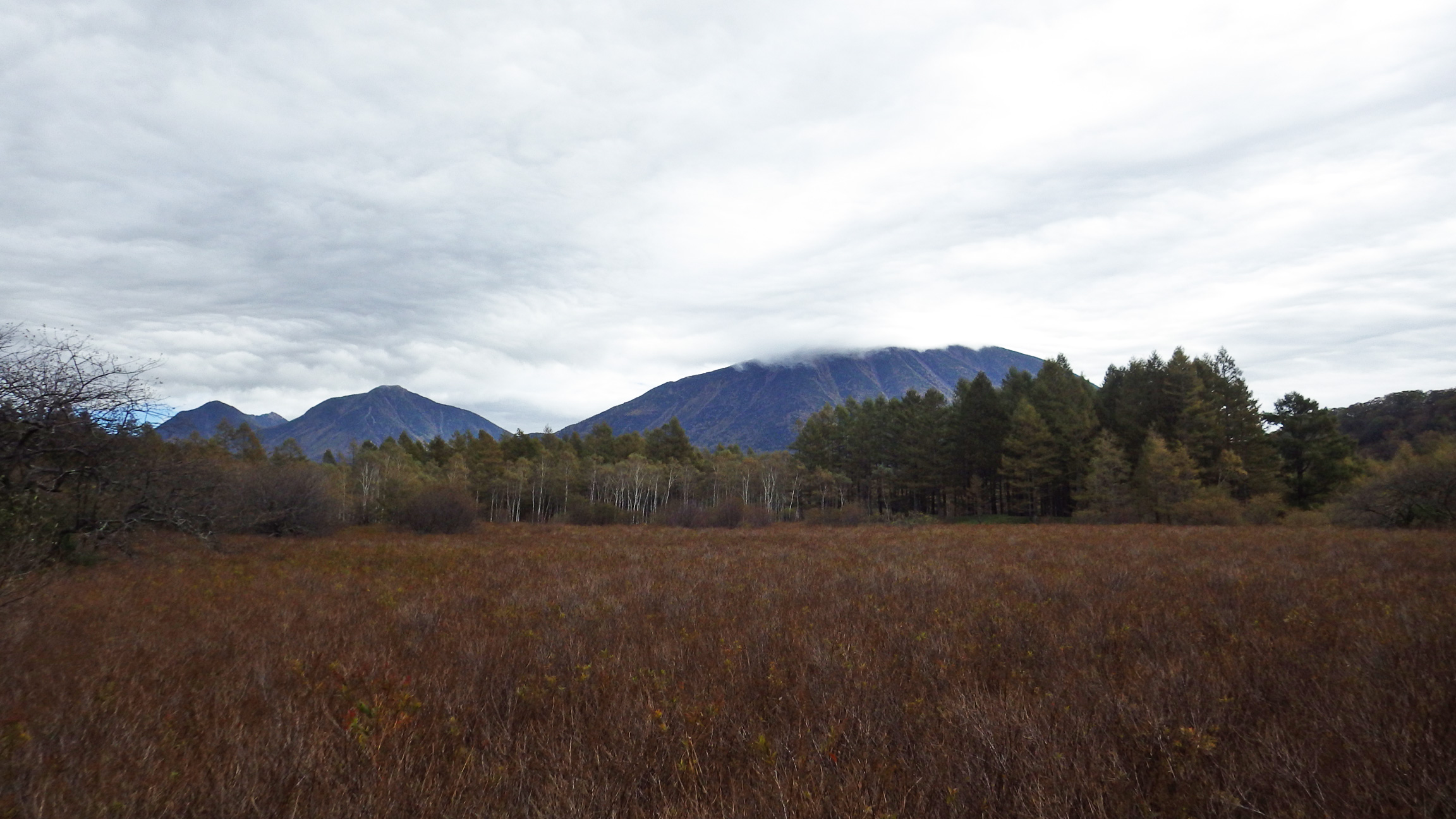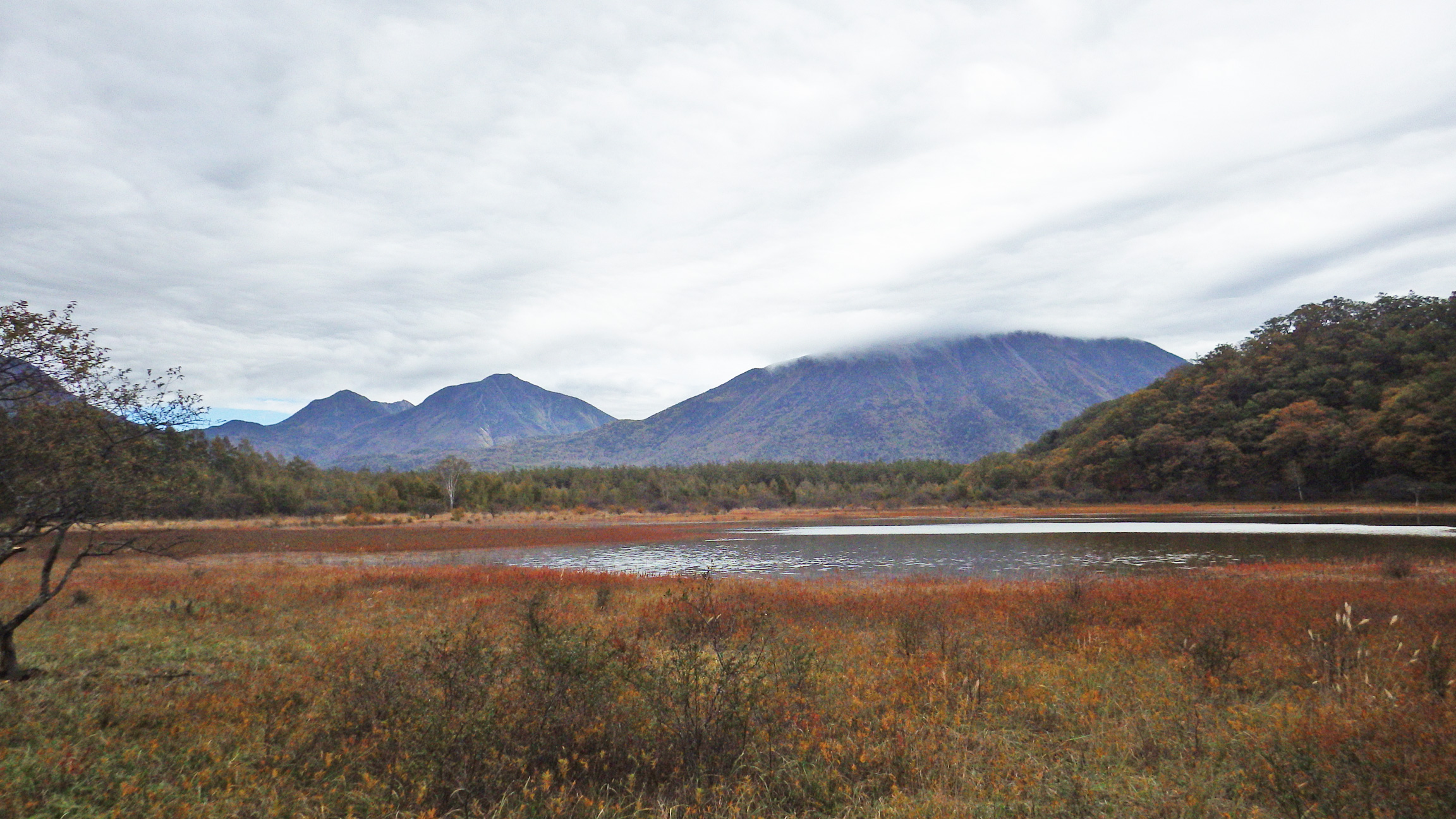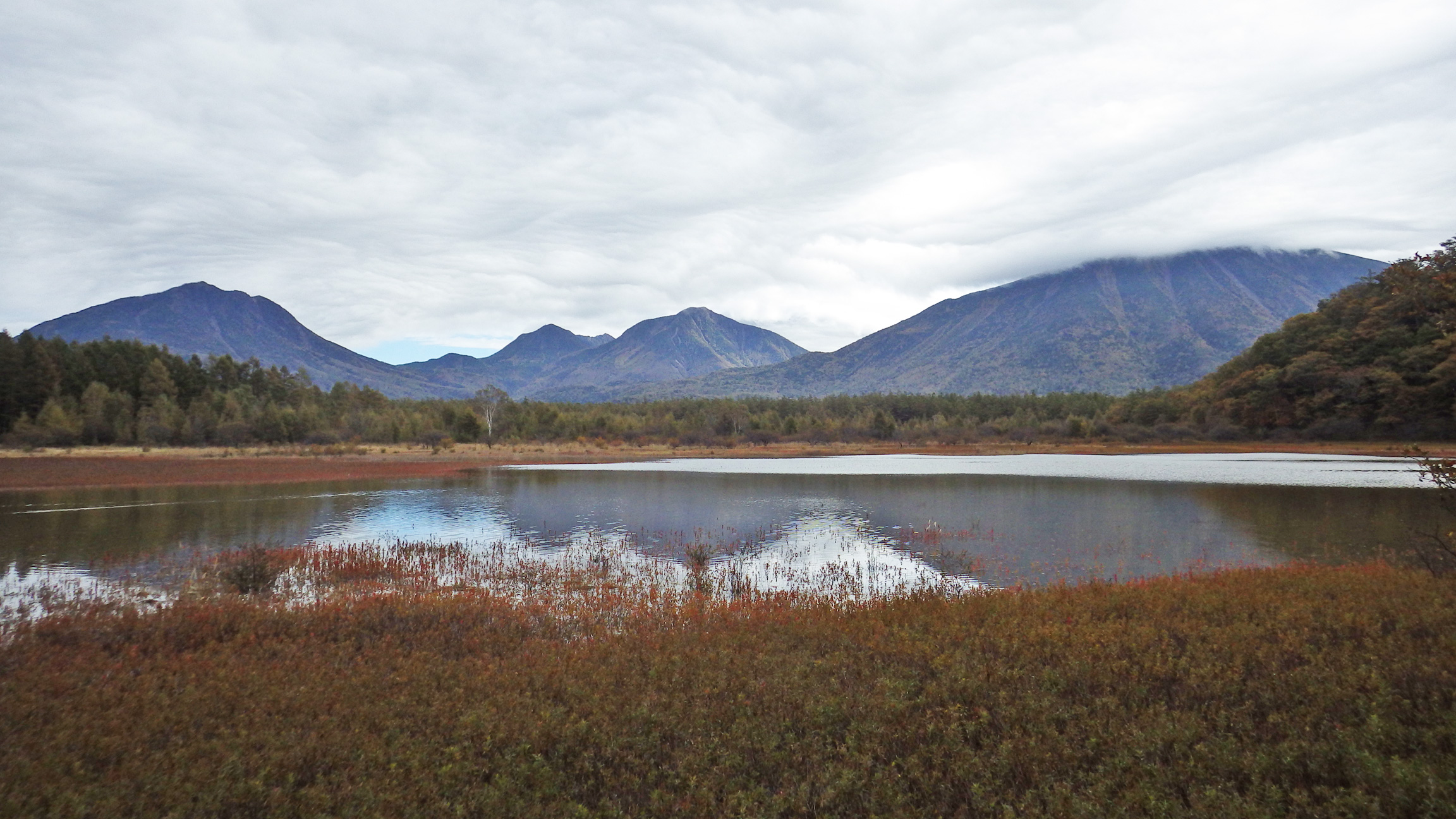 小田代ヶ原湖と男体山、大真名子、小真名子、太郎山。曇ってしまったのであまり色鮮やかではないですね。普段は原っぱになっている小田代ヶ原に大雨が降るとこの様に池ができるので、幻の小田代ヶ原湖と呼ばれています。