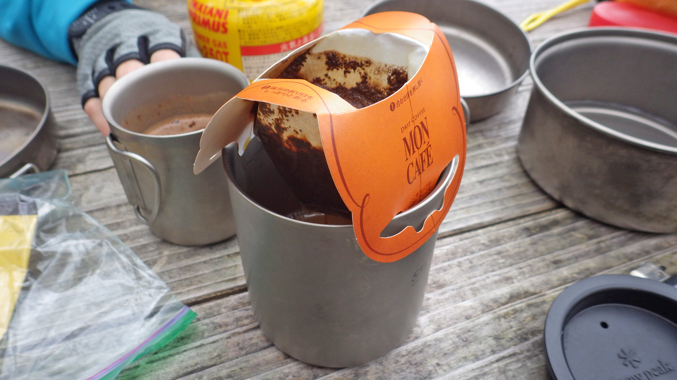 山で市販のドリップコーヒーを楽しむ際によく使うのはこのモンカフェかスタバ。この2種類はコーヒーバッグの底がコップのフチとほぼ同じ高さにあってコーヒーに浸らずにすむため使いやすい。