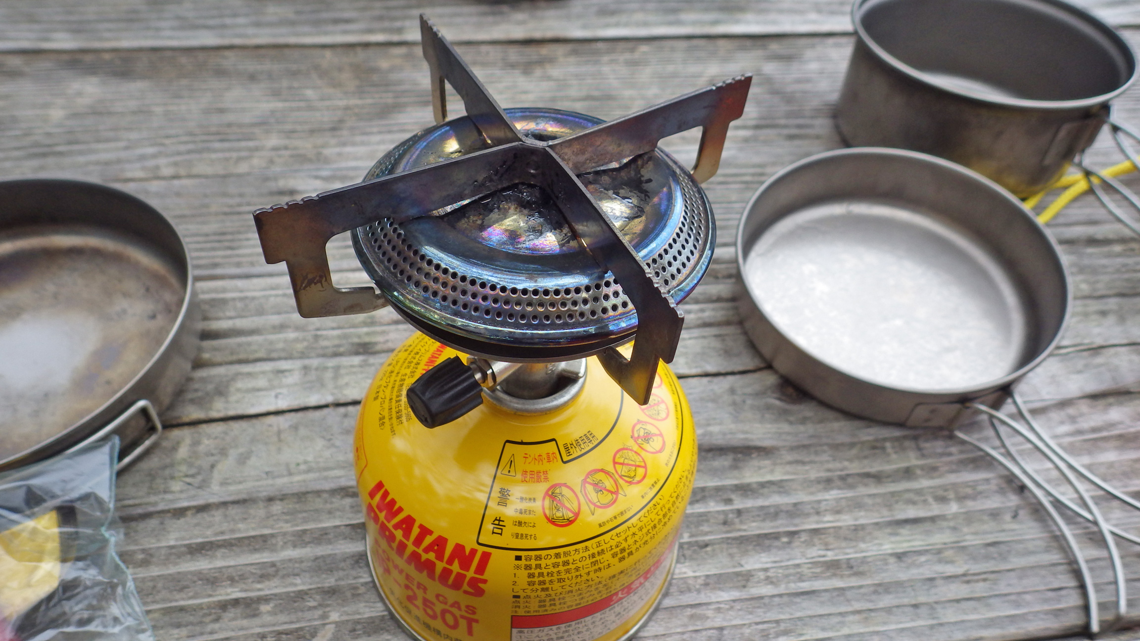 愛用のプリムス2243バーナー。2004年にカリフォルニア州のREIマウンテンビュー店で購入したもの。着火装置は初めから無し。ライターで着火に失敗したことが無いほどこの十字形のゴトクは防風性に優れている。シューっとガスを出してやって、どこかに火が着いていれば風に吹き消された部分にもまたすぐ炎が回ってくれる。他のメーカーの小型バーナーもいいけど、この2243バーナーの頑丈さとゴトクの安定性、着火のしやすさは山へ連れて行くのに安心できる。