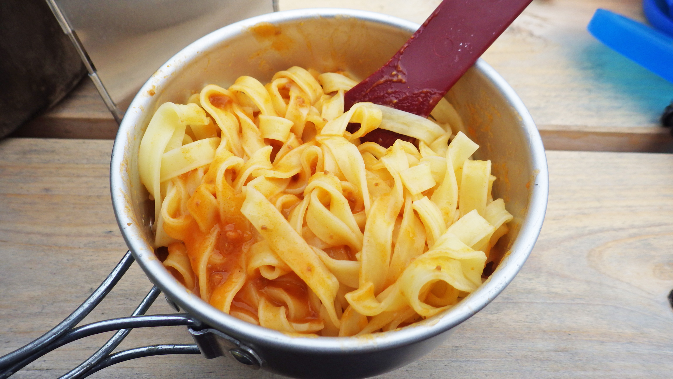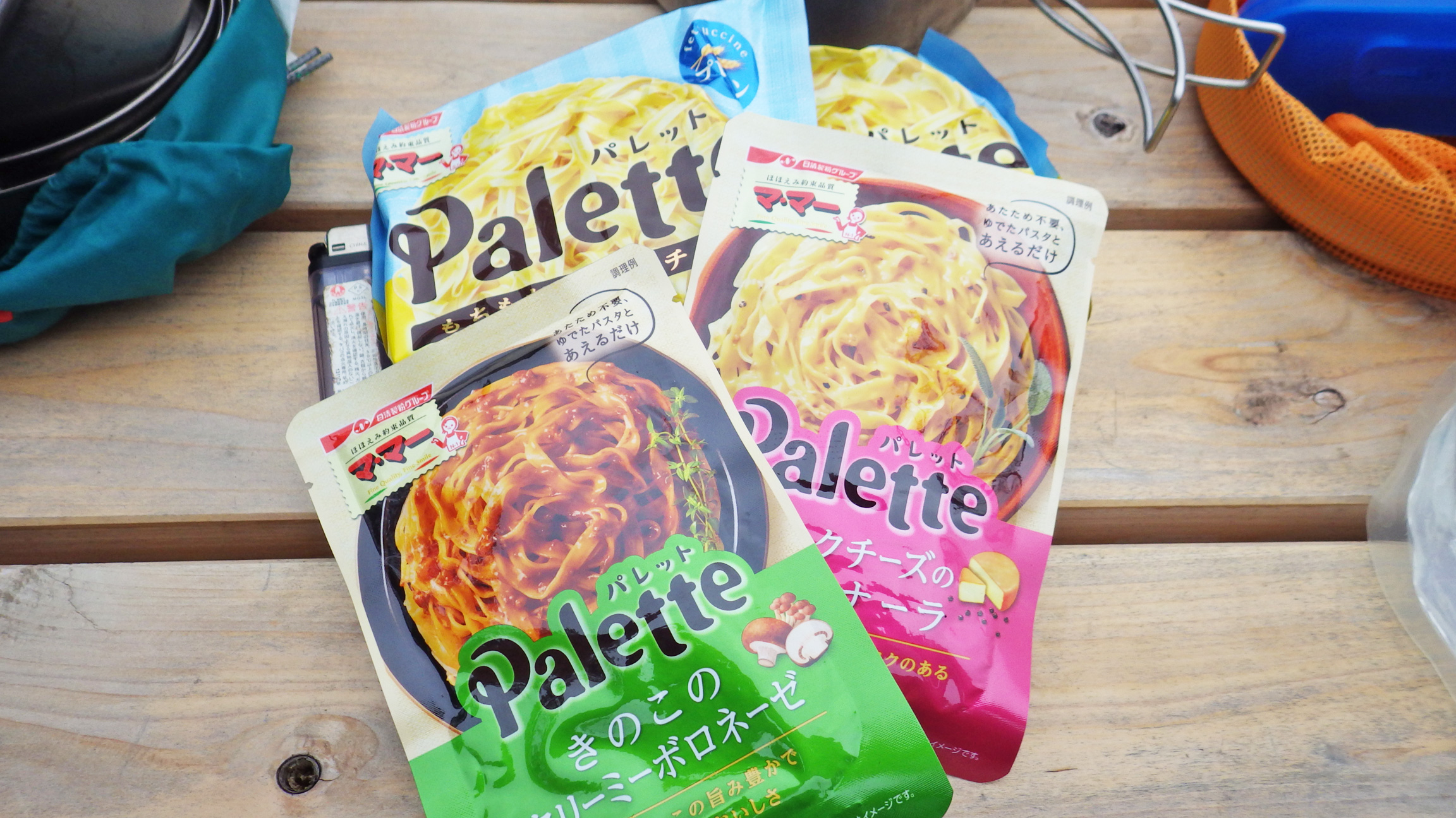 本日のランチはパスタとパンケーキ。なんという組み合わせでしょう!(笑)最近山でよく使うママーのパレットは茹でやすいしおすすめ。ソースもあえるだけのタイプなのでお湯で温める必要なし。
