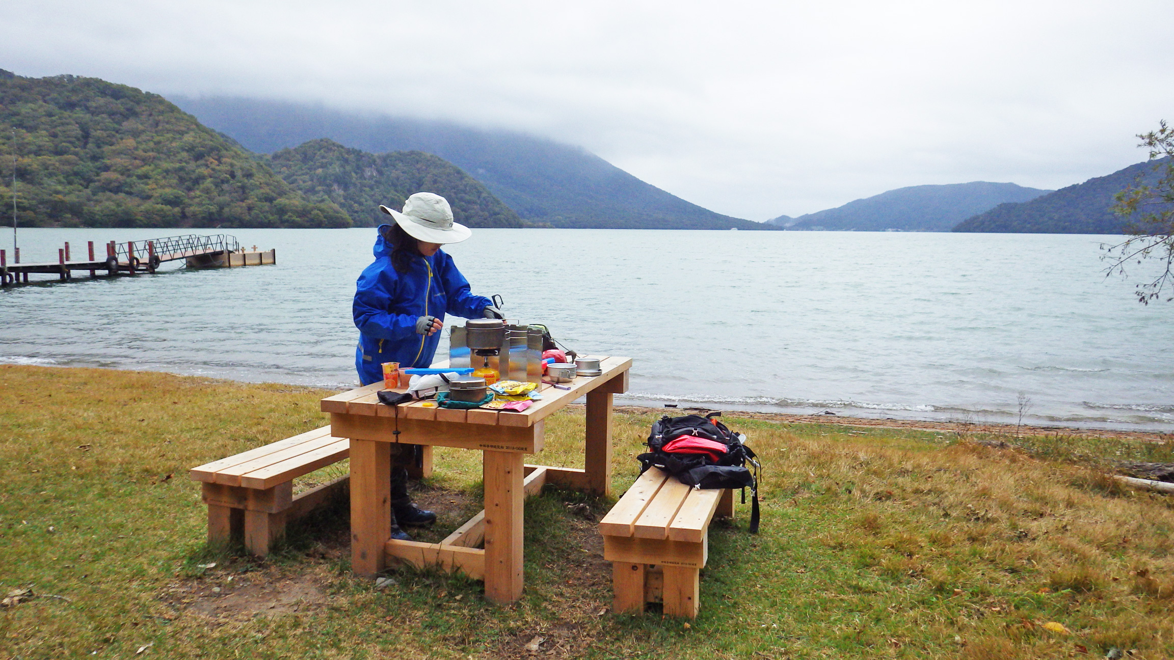 今年作ったばかりのようなテーブルとベンチがあったのでそこでランチの用意。雨はなんとかまだ降らなそう。