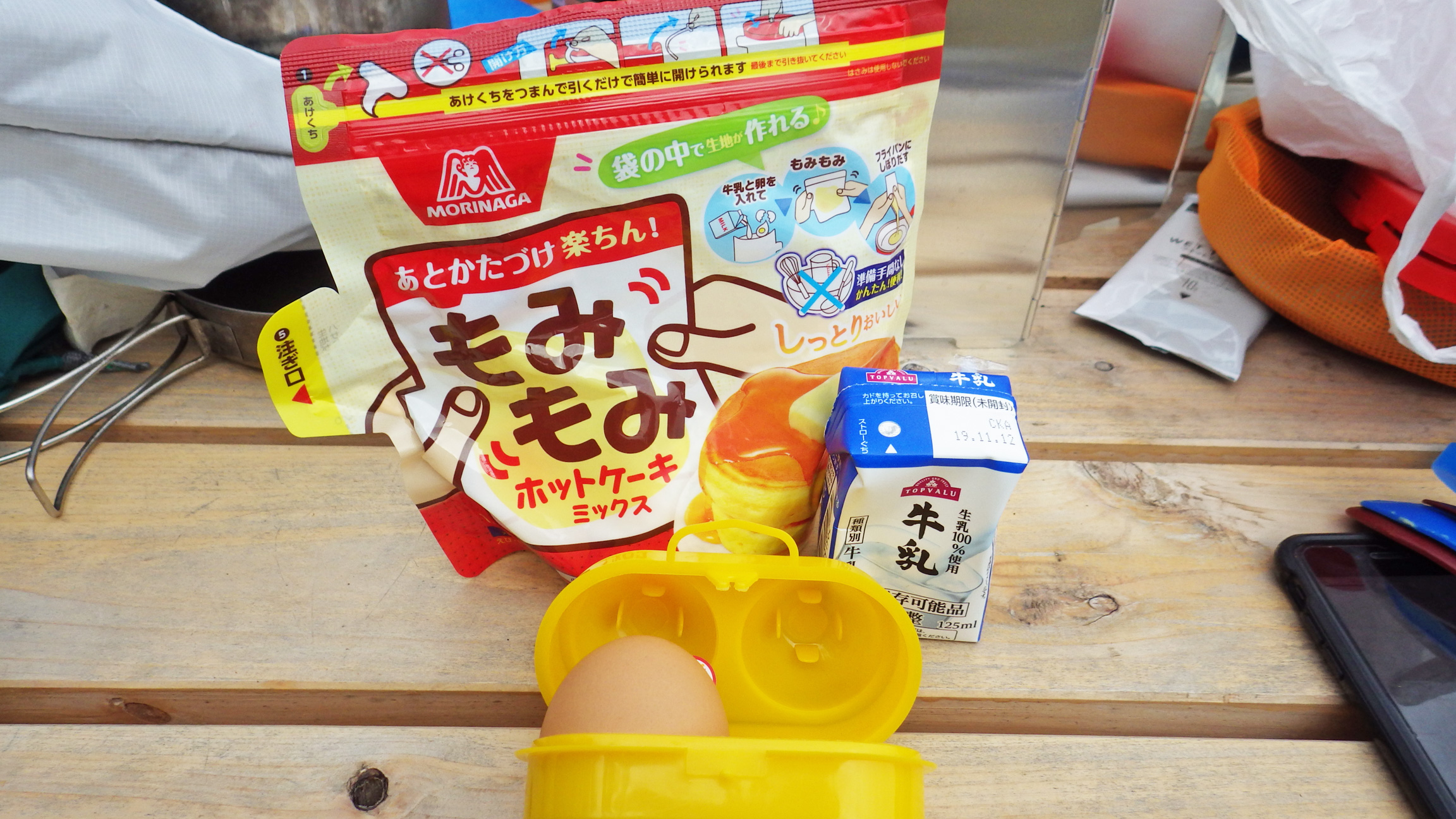 お次は石井スポーツ大宮店で見つけて買ってみた森永のもみもみホットケーキミックス。袋の中に牛乳と卵を投入してもみもみすればパンケーキが作れる!これは山用にいいよ~。もみもみしたい人に超おすすめ。牛乳はイオンで見つけた常温保存可能な60mlパック。この牛乳も登山用に最適。