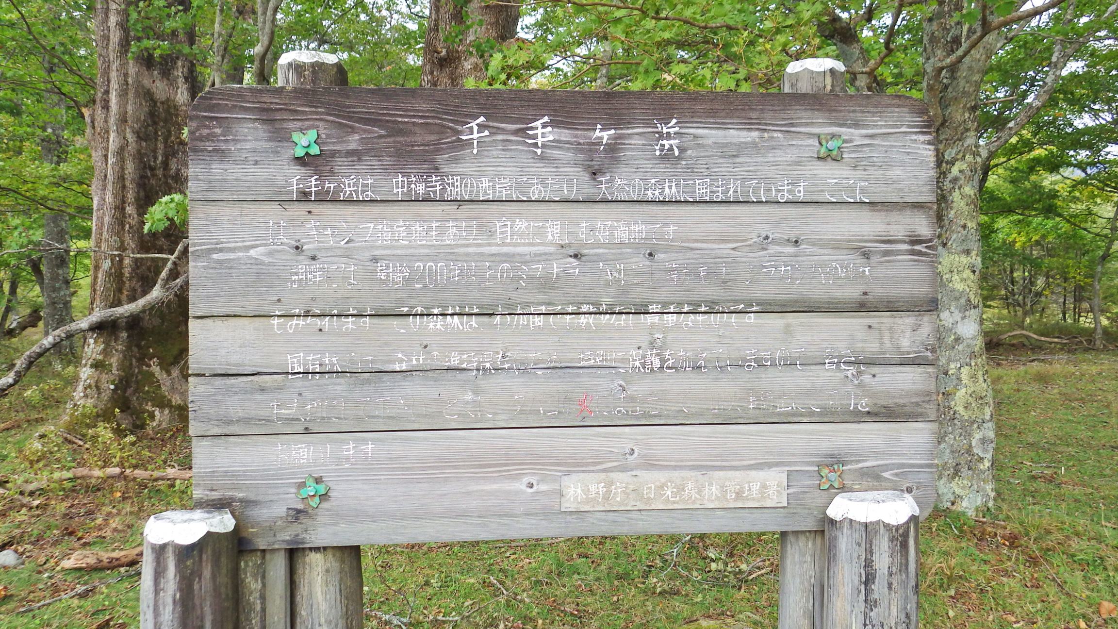 そうそう、千手ヶ浜にはかつてキャンプ場があり自家用車でここまで入れたんですよ。1993年から低公害バスが千手ヶ浜まで運行するようになり、自家用車の乗り入れは出来なくなりました。車道の道幅も狭いですし正解でしょう。ハイキングコースの見回りなどをされる管理者の車は普通に走ってきますので自転車の方は注意。千手ヶ浜のトイレは少し戻ったバス停にしかありませんでした。遊覧船の切符売り場の建物内にトイレがあるかもしれませんが、今日は閉まっていた。
