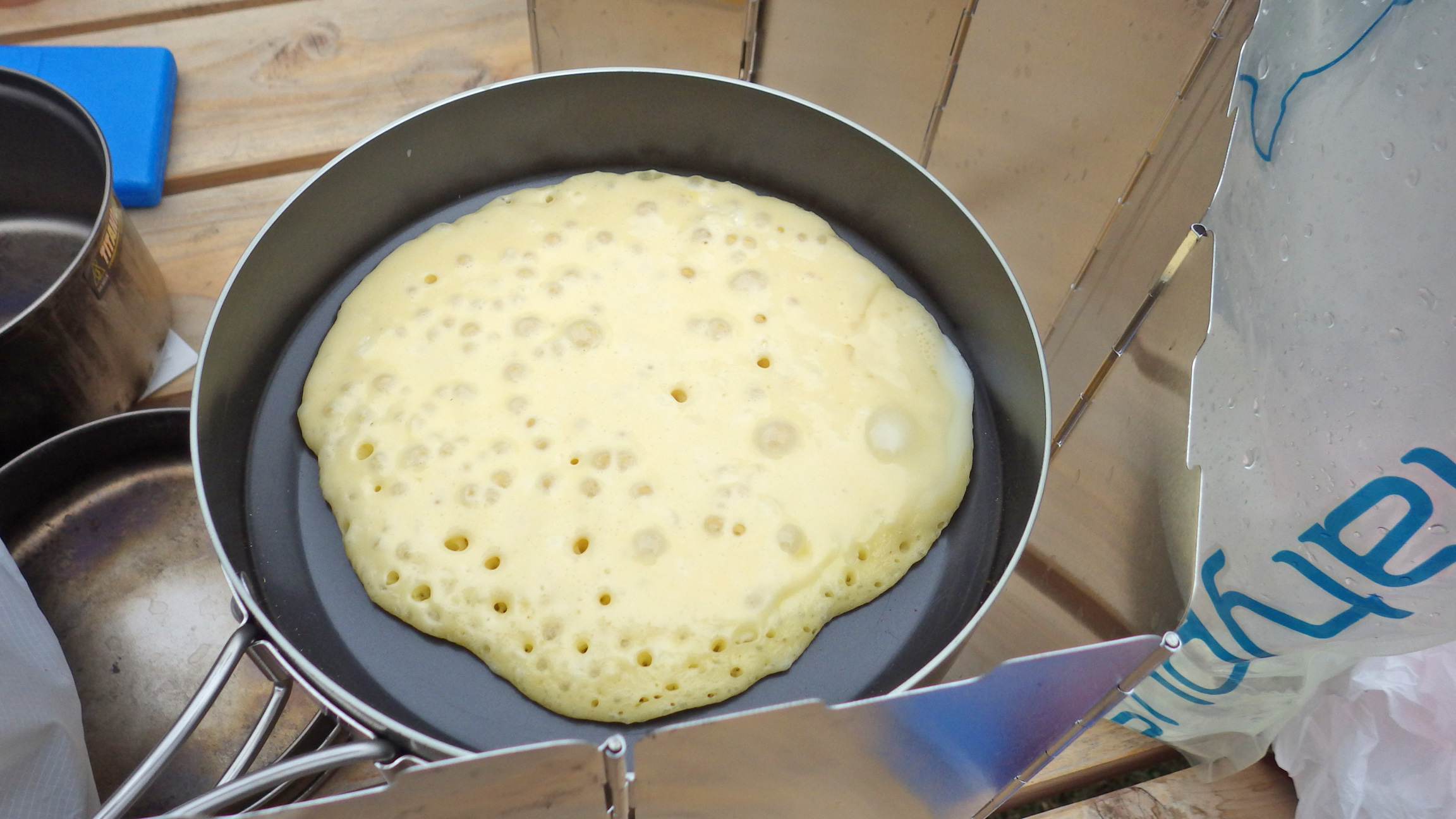 もみもみは子供にやらせた。ユニフレームの山用フライパンで焼いていきます。右端の白い所は混ざりきらなかった卵の白身ですね。やはりボウルでシャカシャカできないと卵の白身は混ざりきらないか。