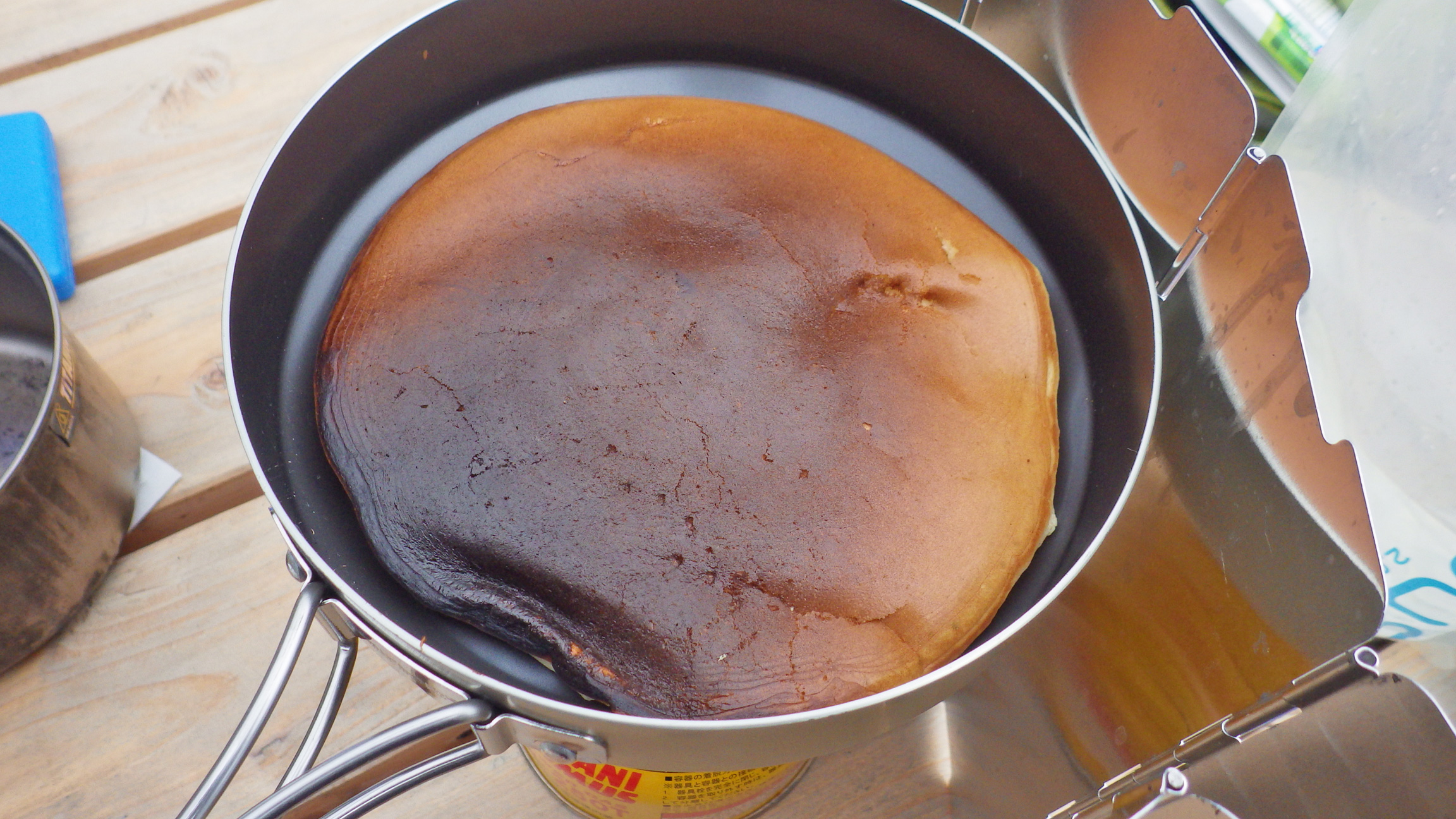 スプーンとフォークでなんとかひっくり返したらちょっと焦げてた。上にかける蜂蜜やバターなどを持ってくるのは忘れちゃいました。チョコクリームとか今度は持ってこよう!