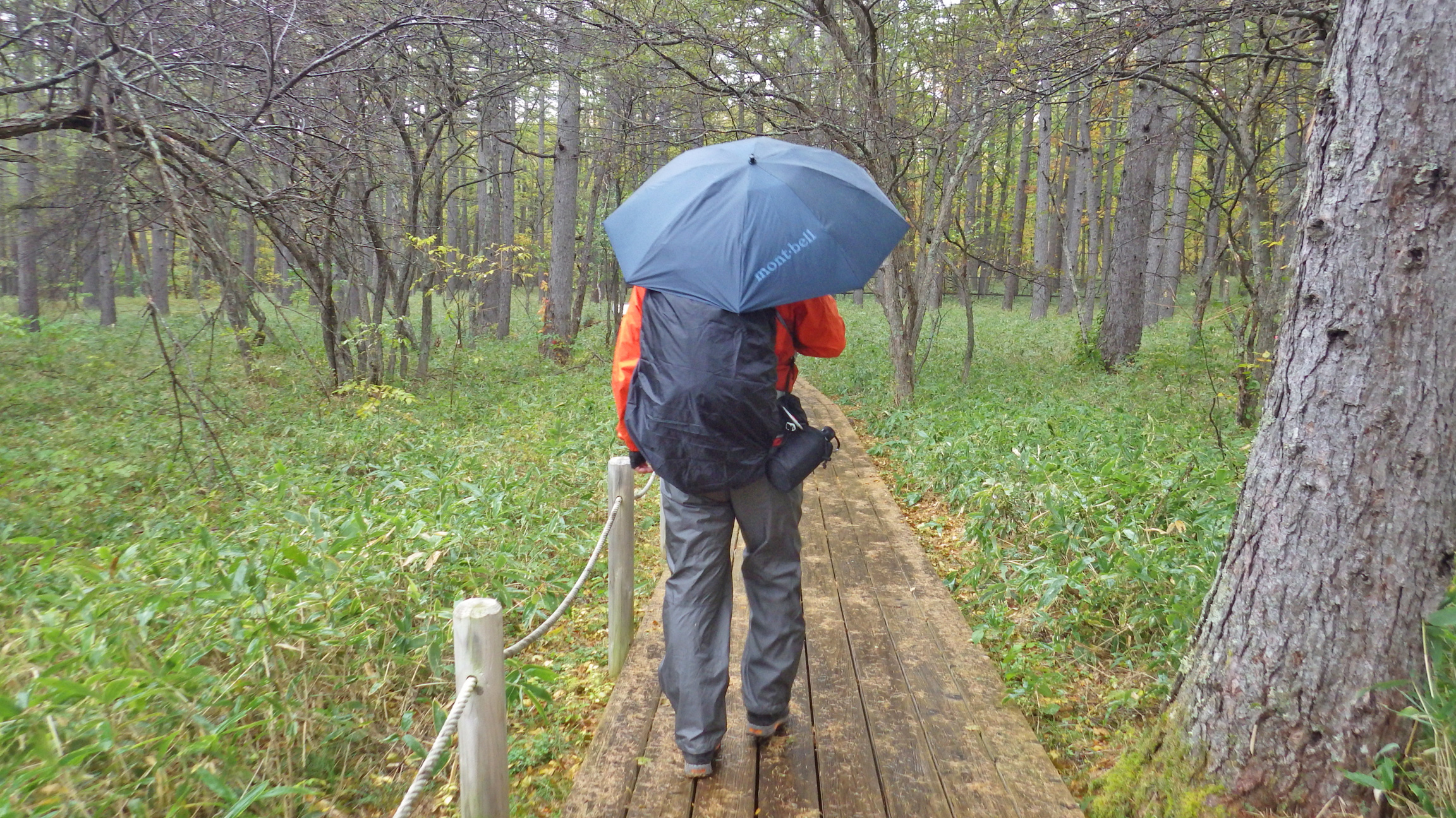 バス停のベンチにも周囲にもトイレの中にもポールはありませんでした~。にゃーん。とぼとぼと赤沼まで歩いて戻ります。14時ごろには雨脚も強まり、雨具を上下着用。モンベルのトレッキング用折り畳み傘は軽くておすすめ。重さ128gでサイドポケットに突っ込んでおいても負担にならない。