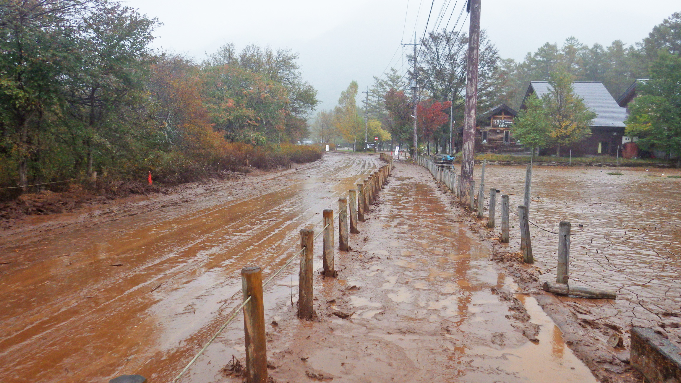 赤沼駐車場への道は台風の影響でこんな状態に。車道はバスが通れるようになっていたのでタイヤの跡をたどって赤沼自然情報センター横のトイレへは行けました。歩道は深さ10cm以上の泥に覆われていて、いくら登山靴を履いているといっても歩きたくなかった。