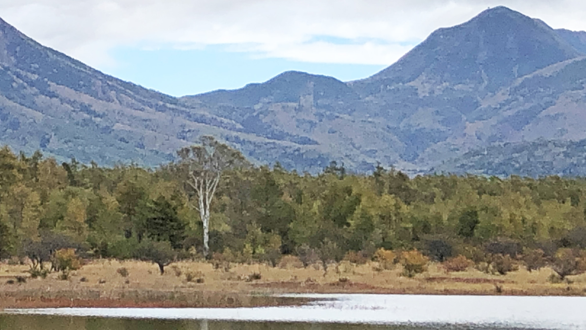40分ほどで小田代ヶ原をぐるっと周回して休憩所に到着。対岸に「白い貴婦人」と呼ばれる白樺が独り立っているのが見える。拡大すると…
